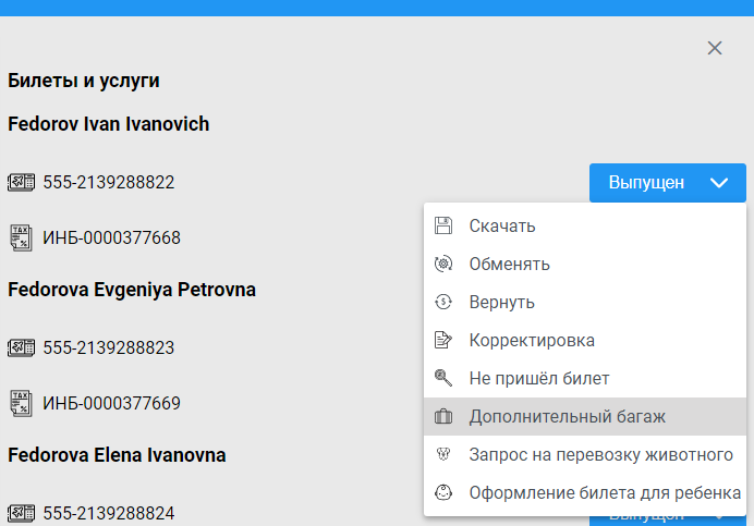 Если вам нужно оформить дополнительный багаж к вашему билету, перейдите в личный кабинет и выберите интересующий вас заказ из списка.